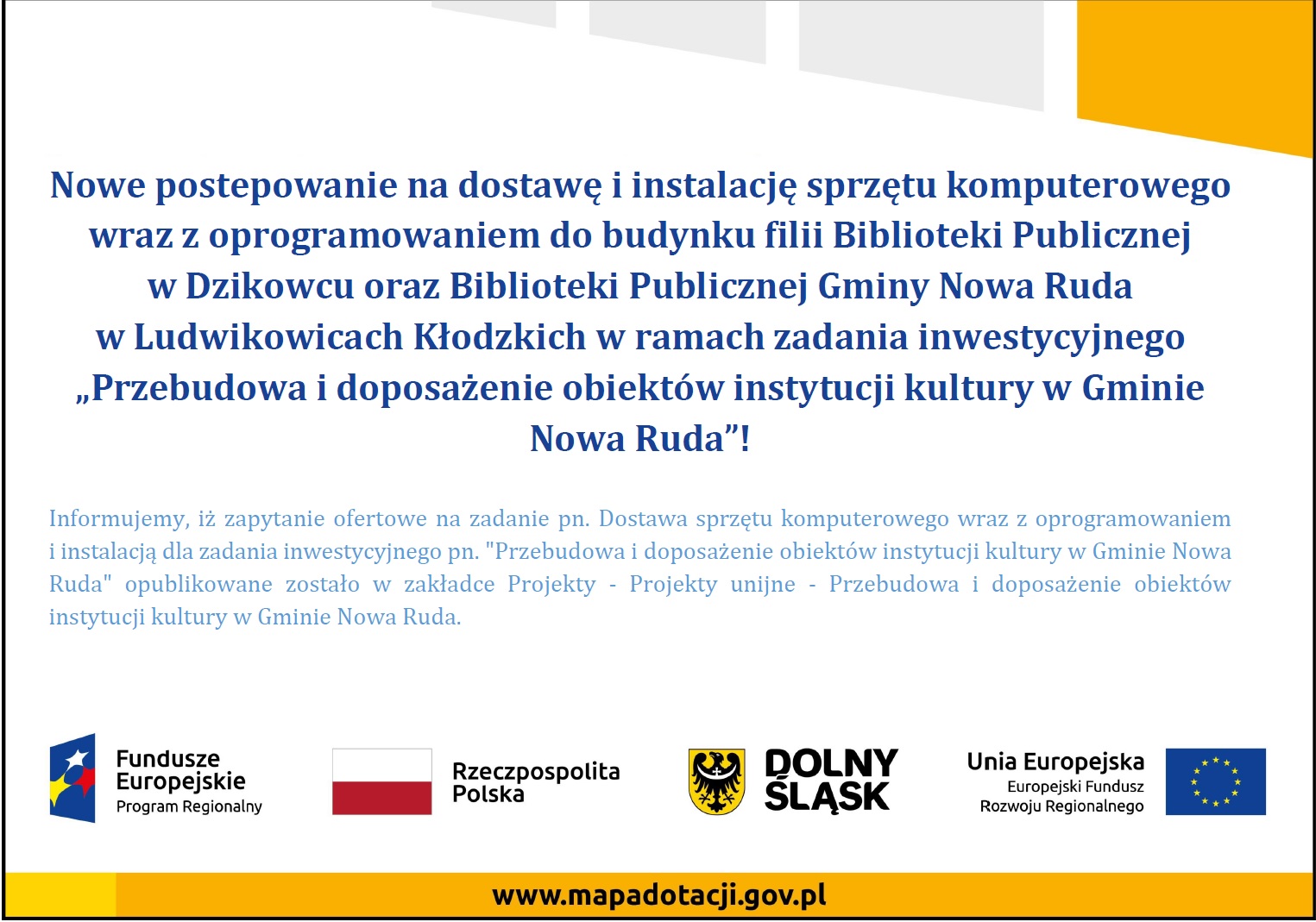 Przedmiotem zamówienia jest dostawa sprzętu komputerowego wraz oprogramowaniem i instalacją dla zadania inwestycyjnego pn.: „Przebudowa i doposażenie obiektów instytucji kultury w Gminie Nowa Ruda”.