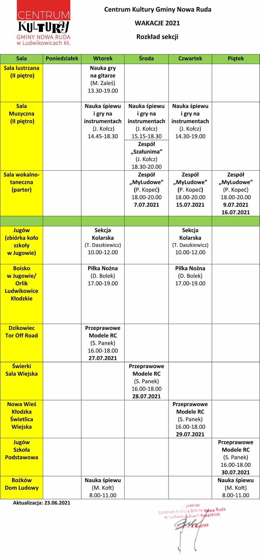 W tym roku podczas wakacji, sekcje będą się odbywać według poniższego harmonogramu.
